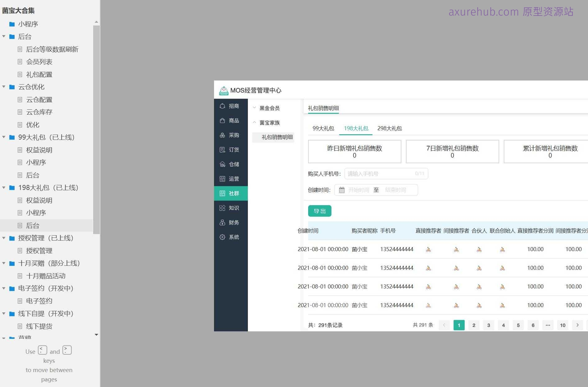 这个原型项目是一个名为“菌宝大合集”的小程序及其后台管理系统。它旨在为用户和管理员提供一个平台,用于管理会员等级、礼包配置、云仓库存等,以及进行营销活动和用户授权管理。