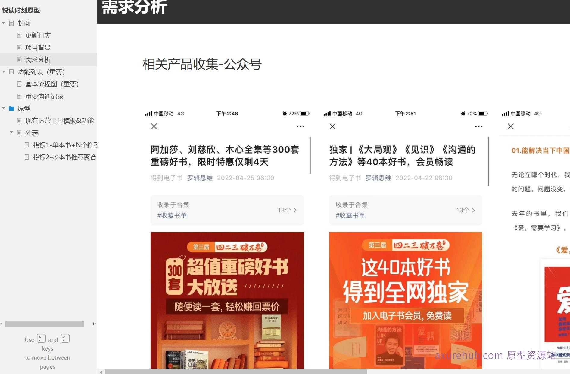 这是一个名为“悦读时刻”的原型项目,旨在为书籍推荐和运营提供一套完整的工具模板。原型通过Axure工具创建,包含11个页面,覆盖从封面到具体功能模块的详细介绍。