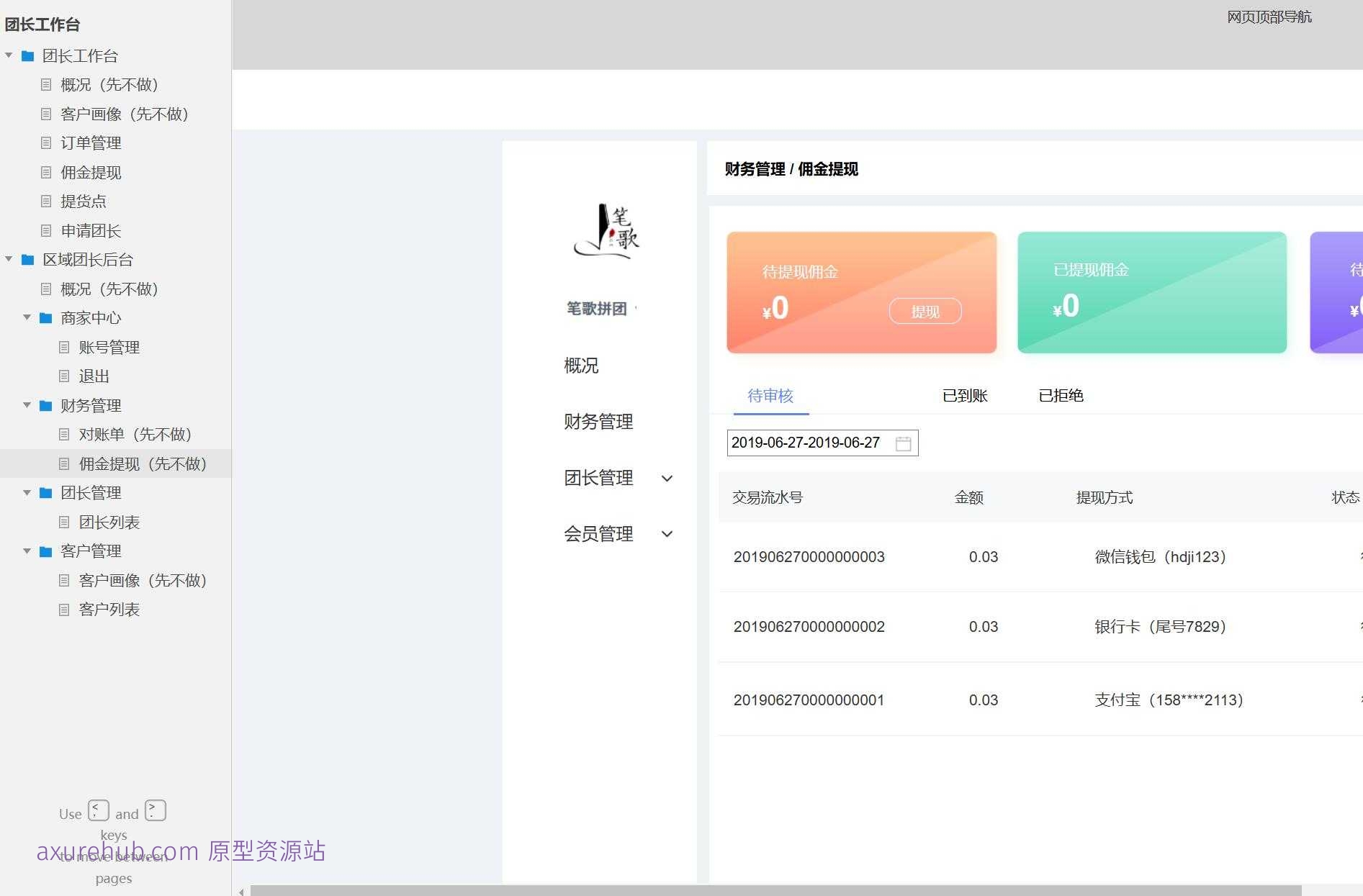 佣金提现:团长可以查看自己的佣金,并进行提现操作。