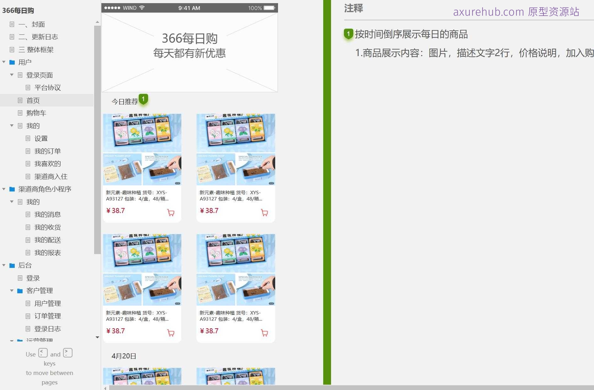 这个原型项目是一个电商平台,名为“366每日购”,它包含了用户端和渠道商端的功能,旨在提供一个全面的在线购物解决方案。