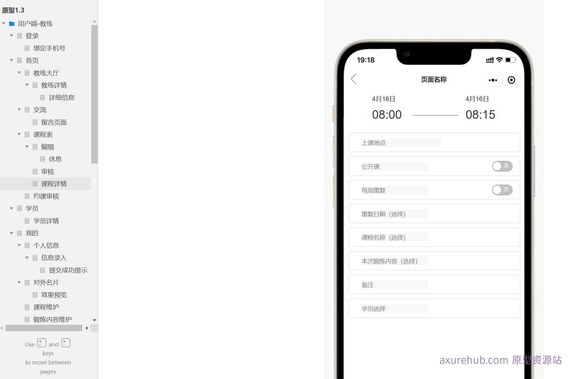 这个原型是一个用户端和教练端的教练管理平台,包含了49个页面,覆盖了从用户登录到课程管理的整个流程。