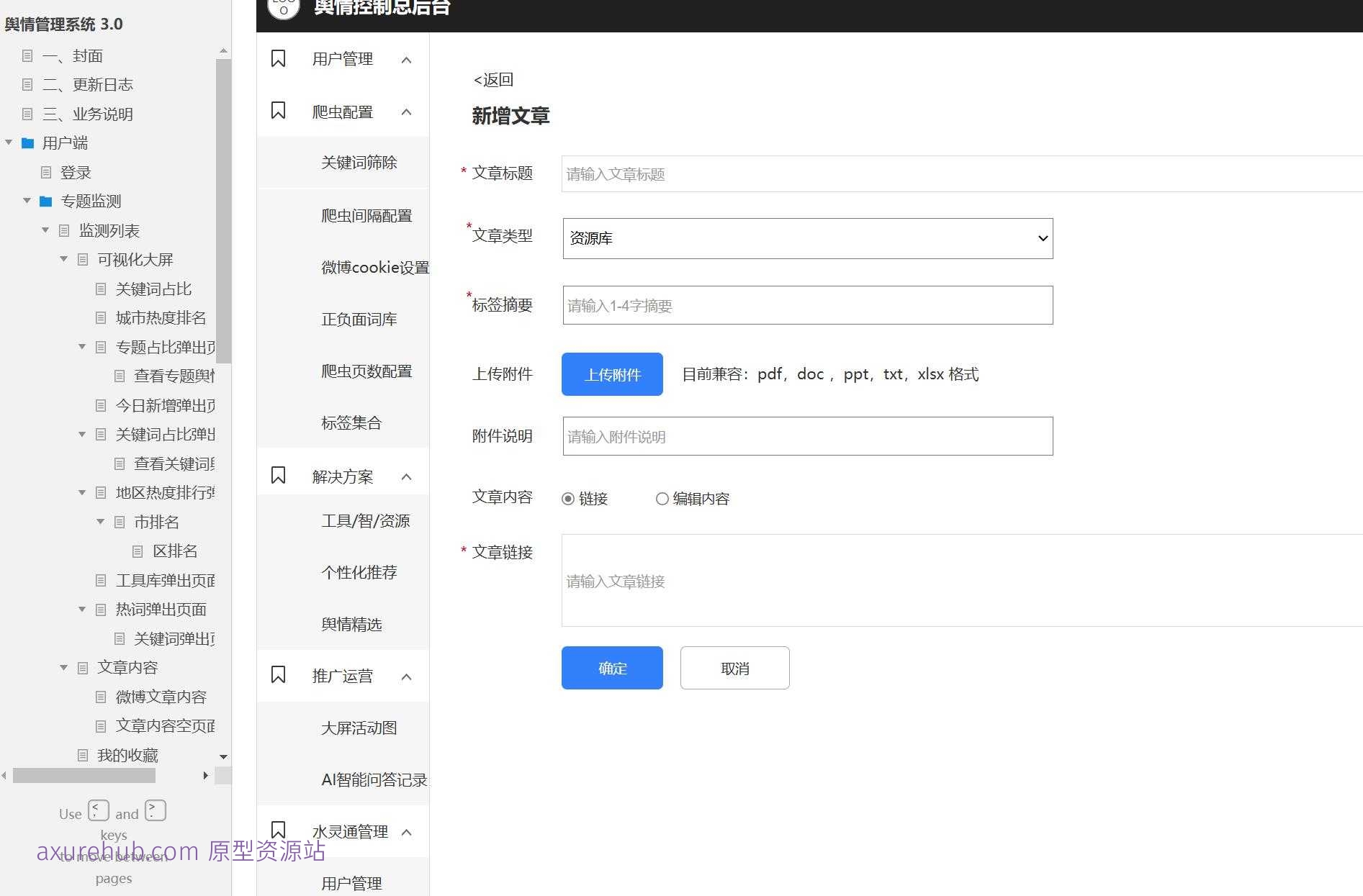 一、封面、二、更新日志、三、业务说明、登录、监测列表、可视化大屏、关键词占比、城市热度排名、专题占比弹出页面、查看专题舆情、今日新增弹出页面、关键词占比弹出页面、查看关键词舆情、地区热度排行弹出页面、市排名、区排名、工具库弹出页面、热词弹出页面、关键词弹出页面、文章内容、微博文章内容、文章内容空页面、我的收藏、标签、角色设置、定制大屏、专题分组设置、解决方案、系统推荐、我的推荐、新增推荐、智能AI问答、登陆、用户管理、关键词筛除、爬虫间隔配置、微博cookie设置、正负面词库、爬虫页数配置、标签集合、工具/智/资源、资源库、个性化推荐、舆情精选、大屏活动图、AI智能问答记录、用户管理、团队成员、大屏展示舆情管理系统3.0大屏展示Axure原型模板 舆情管理系统3.0大屏展示Axure原型模板 舆情管理系统3.0大屏展示Axure原型模板 舆情管理系统3.0大屏展示Axure原型模板 舆情管理系统3.0大屏展示Axure原型模板