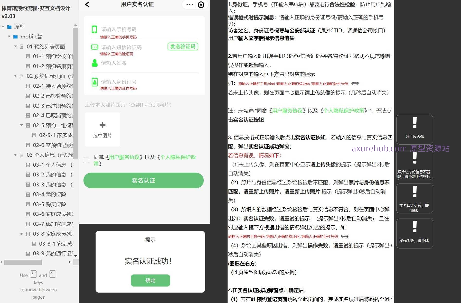 01 预约列表页面、01-1 预约学校详情页面、01-2 预约结果页面、02 预约记录页面(全部记录)、02-1 待入场预约记录、02-2 已核验预约记录、02-3 已过期预约记录、02-4 已取消预约记录、02-5 预约二维码页面、02-5-1 家庭成员二维码页面、02-6 空预约记录页面、03 个人信息(已登录已实名认证)、03-1 个人信息 (已登录未实名认证)、03-2 我的信息 (已登录已实名认证)、03-3 我的信息 (已登录未实名认证)、03-4 我的保险、03-5 购买保险、03-6 家庭成员列表(无记录)、03-7 添加家庭成员、03-8 家庭成员列表(有记录)、03-8-1 家庭成员信息、03-9 我的通行记录、04 个人信息(未登录)、04-1 登录页面、04-2 添加其他号码、04-3 用户实名认证页面、登录页面、预约记录查询、预约字段配置、通知公告维护、预约须知配置、访客通行记录、门禁设备管理、门禁授权管理、用户管理智慧校园体育馆预约管理系统Axure原型模板 智慧校园体育馆预约管理系统Axure原型模板 智慧校园体育馆预约管理系统Axure原型模板 智慧校园体育馆预约管理系统Axure原型模板 智慧校园体育馆预约管理系统Axure原型模板